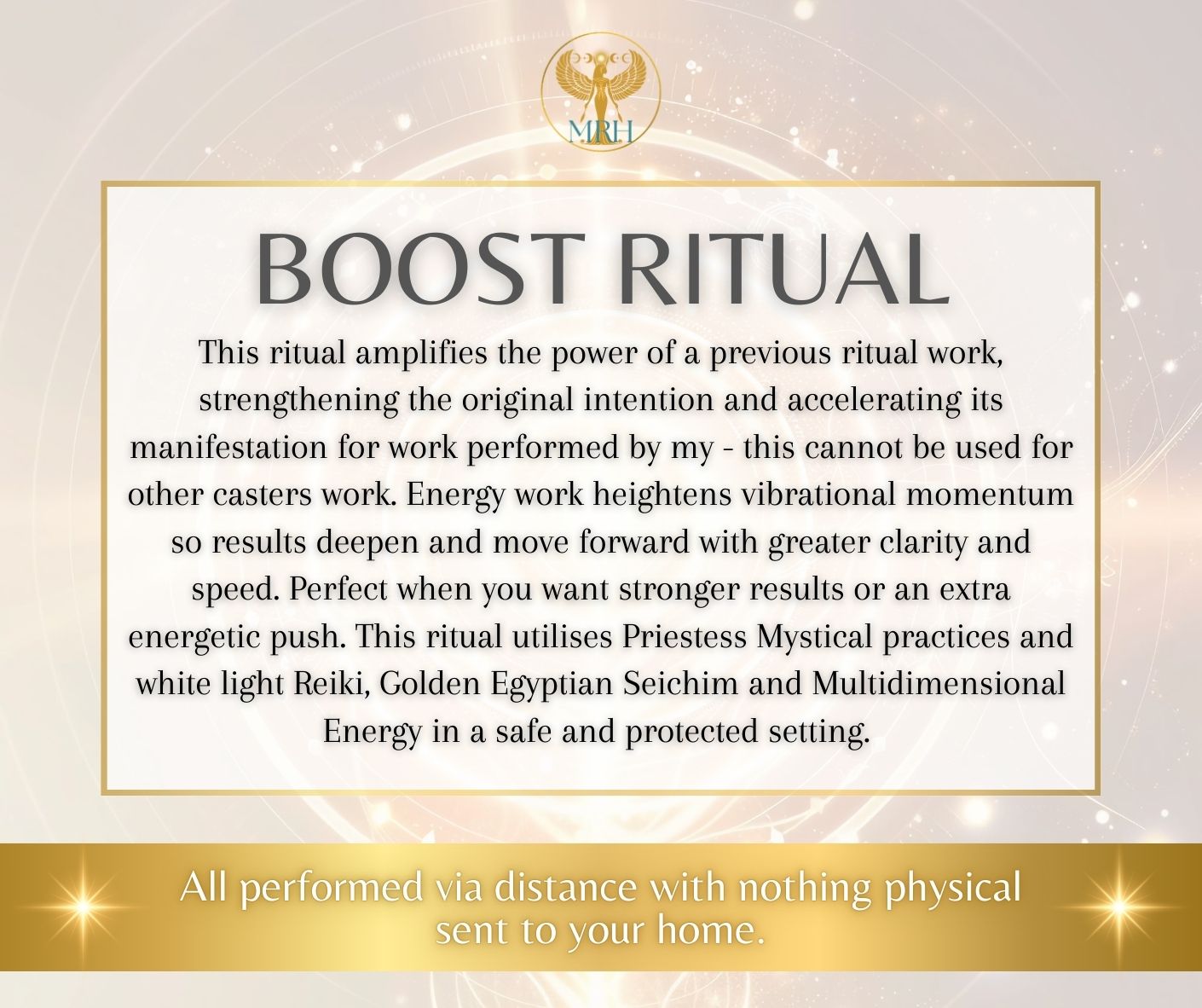 FOR PREVIOUS RITUALS CAST BY ME ONLY (not other casters or your own spell crafting) - Elevate cast ritual craft to new heights with our mystical Spell Boosters, designed to amplify the potency and speed of your magical intentions. Picture it as infusing your spell with celestial energy, propelling it forward like a shooting star towards your desired outcomes. Whether you're embarking on a grand quest or seeking swift manifestations, our boosters imbue your spells with unparalleled strength and efficacy.