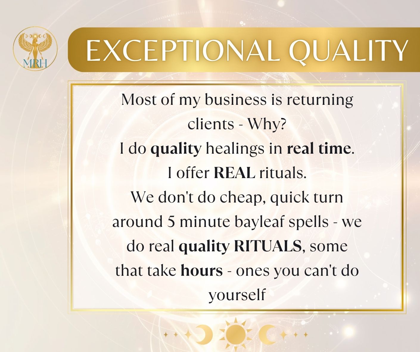 All rituals and healings are performed through distance energy work, which means you do not need to be online or present at any particular time. I connect with your field in my own sacred working time, tuning into your energy and completing the ritual or healing with full focus and intention. Once the work is complete, you will receive a message and a photograph of your ritual set-up ✨🤍✨