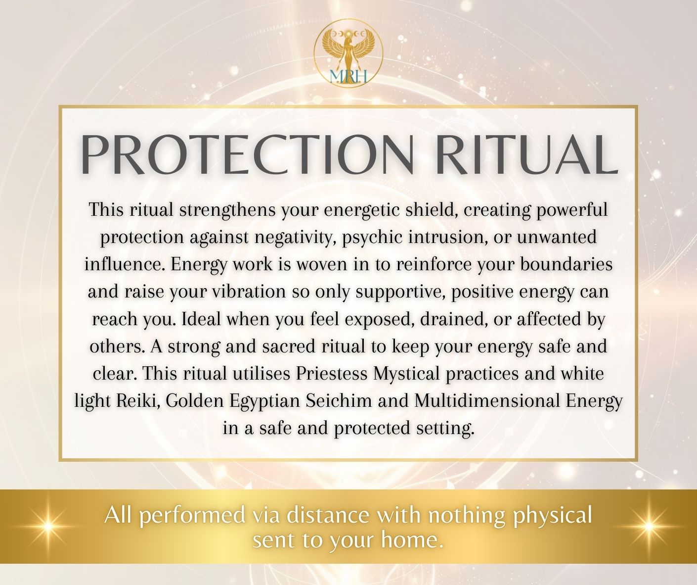 This ritual strengthens your energetic shield, creating powerful protection against negativity, psychic intrusion, or unwanted influence. Energy work is woven in to reinforce your boundaries and raise your vibration so only supportive, positive energy can reach you. Ideal when you feel exposed, drained, or affected by others. A strong and sacred ritual to keep your energy safe and clear.