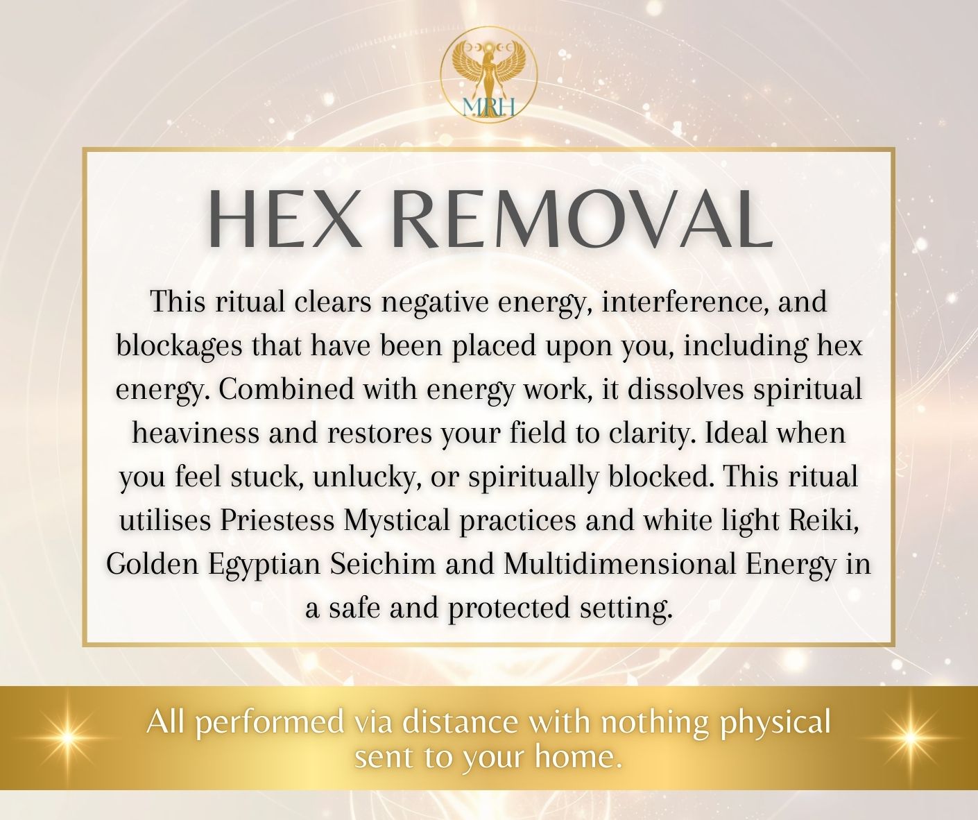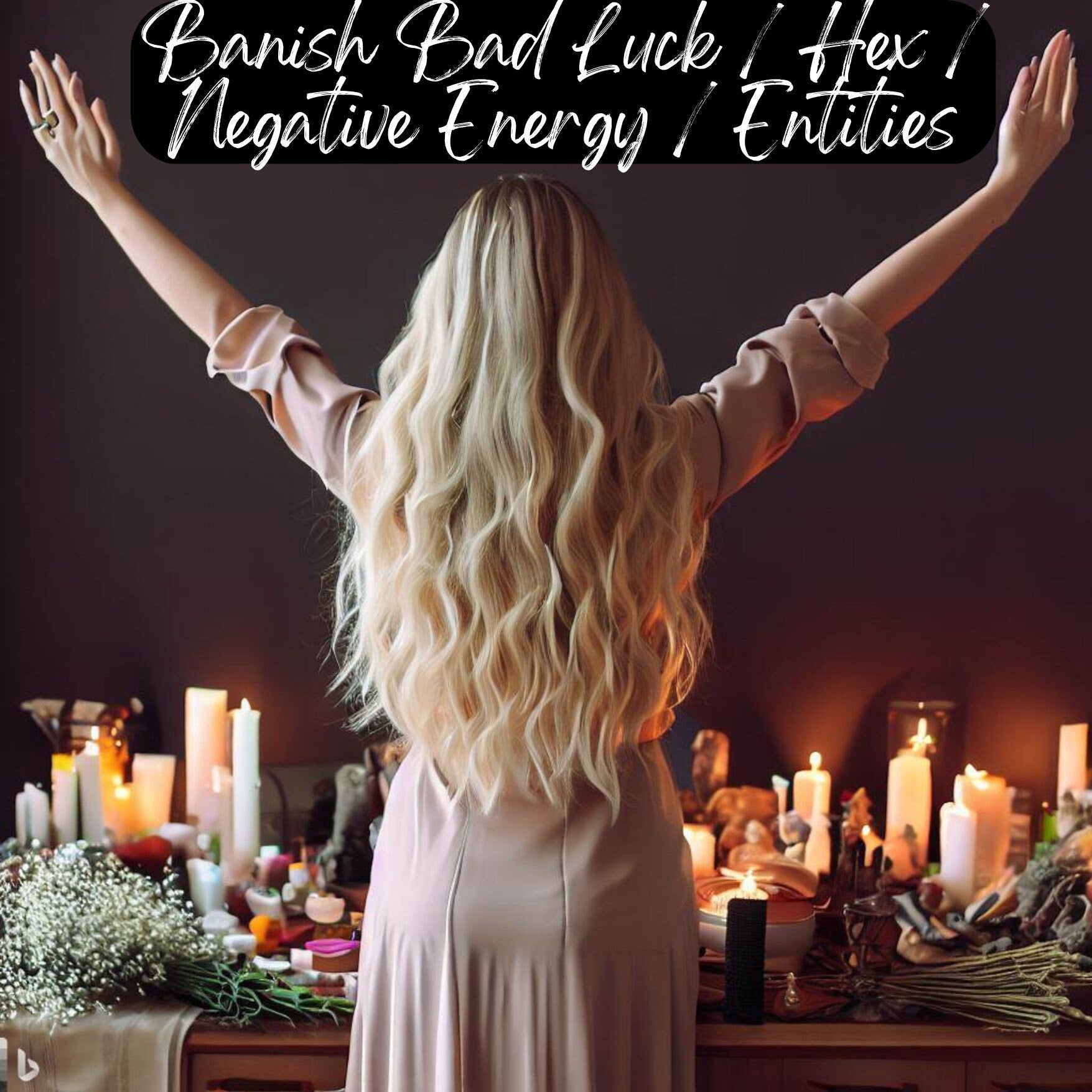 This ritual clears negative energy, interference, entity and singular hex energies and blockages that have been placed upon you or built up over time. Combined with energy work, it dissolves spiritual heaviness and restores your field to clarity and protection. Ideal when you feel stuck, unlucky, or spiritually blocked. A full reset for your energy and path.