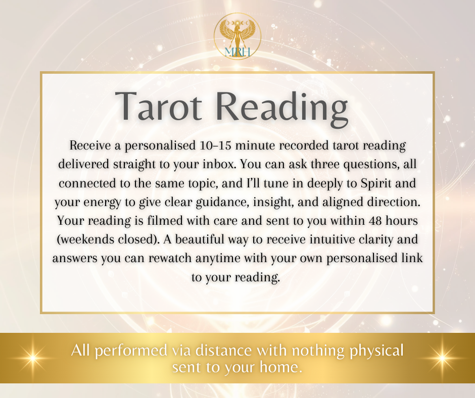 Receive a personalised 10–15 minute recorded tarot reading delivered straight to your inbox. You can ask three questions, all connected to the same topic, and I’ll tune in deeply to your energy to give clear guidance, insight, and aligned direction. Your reading is filmed with care and a private unlisted link issent to you within 48 hours (weekends closed). A beautiful way to receive intuitive clarity and answers you can rewatch anytime.